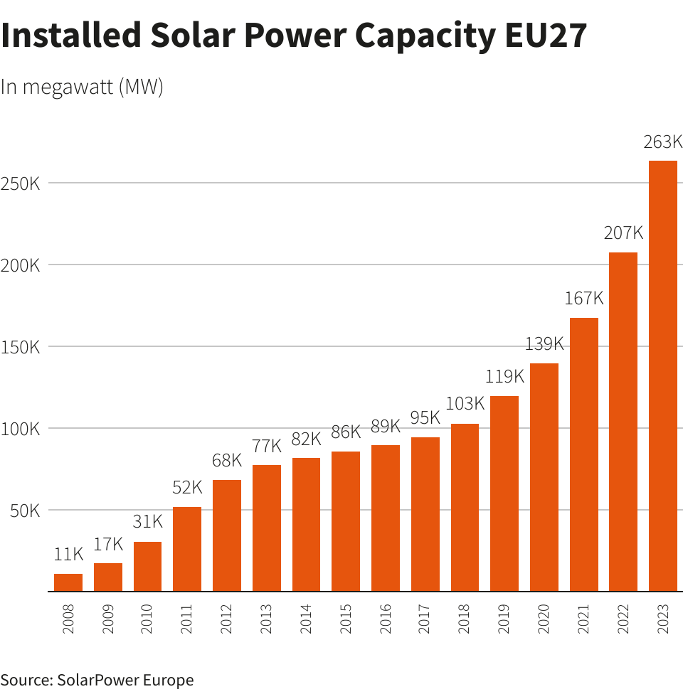Η εγκατεστημένη φωτοβολταϊκή ισχύς στην Ευρωπαϊκή Ένωση υπερδιπλασιάστηκε σε 263 GW μεταξύ 2019 και 2023, σύμφωνα με τα στοιχεία της SolarPower Europe. Μόνο το 2023, αυτό ισοδυναμεί με την εγκατάσταση 306.000 επιπλέον φωτοβολταϊκών πάνελ κάθε μέρα, δήλωσε ο όμιλος.
