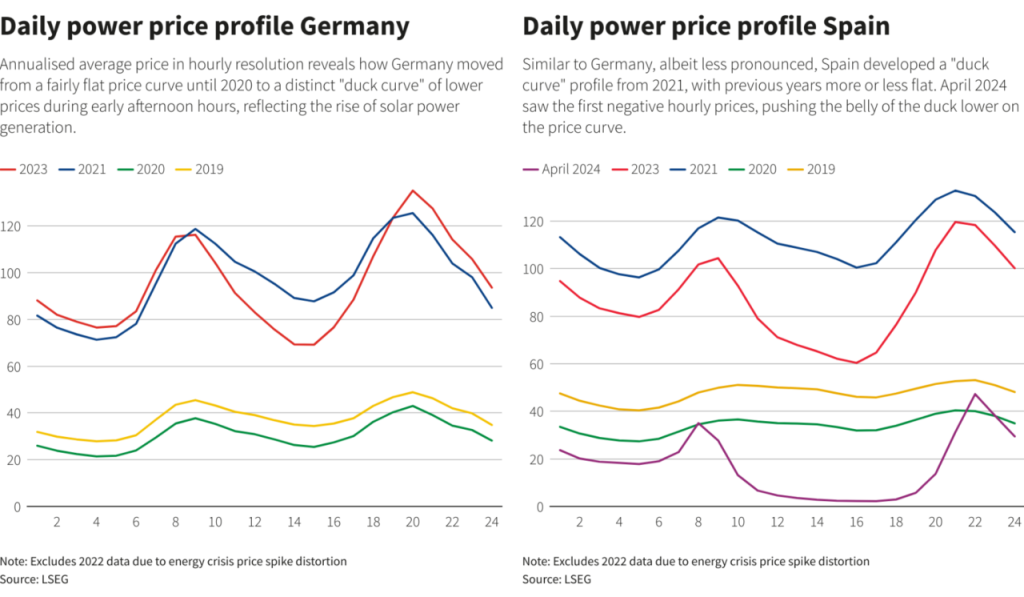 Οι αρνητικές τιμές δεν είναι κάτι καινούργιο στη Γερμανία, η οποία φιλοξενεί τη μεγαλύτερη δυναμικότητα της Ευρώπης σε μεταβλητή παραγωγή ηλιακής και αιολικής ενέργειας, αλλά το 2024 είναι το πρώτο έτος που στο γκρουπ αυτό θα προστεθεί και η Ισπανία, έπειτα από αρκετά χρόνια ισχυρής ανάπτυξης της ηλιακής ενέργειας.