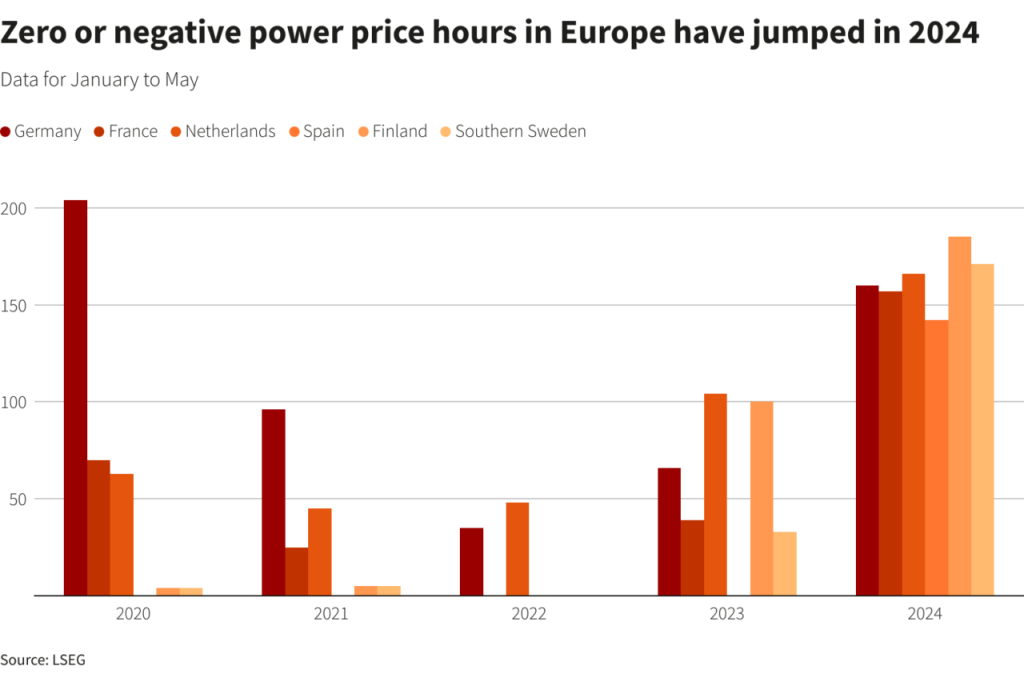 Τους πρώτους πέντε μήνες του έτους και σε περιόδους χαμηλής ζήτησης, στις περισσότερες από τις βασικές οικονομίες της Ευρώπης, οι χονδρικές αγορές ηλεκτρικής ενέργειας εμφάνισαν μηδενικές ή αρνητικές τιμές. Αυτό σημαίνει ότι οι παραγωγοί πρέπει συχνότερα να πληρώνουν για να εκφορτώσουν ενέργεια ή να σταματήσουν τις μονάδες τους.