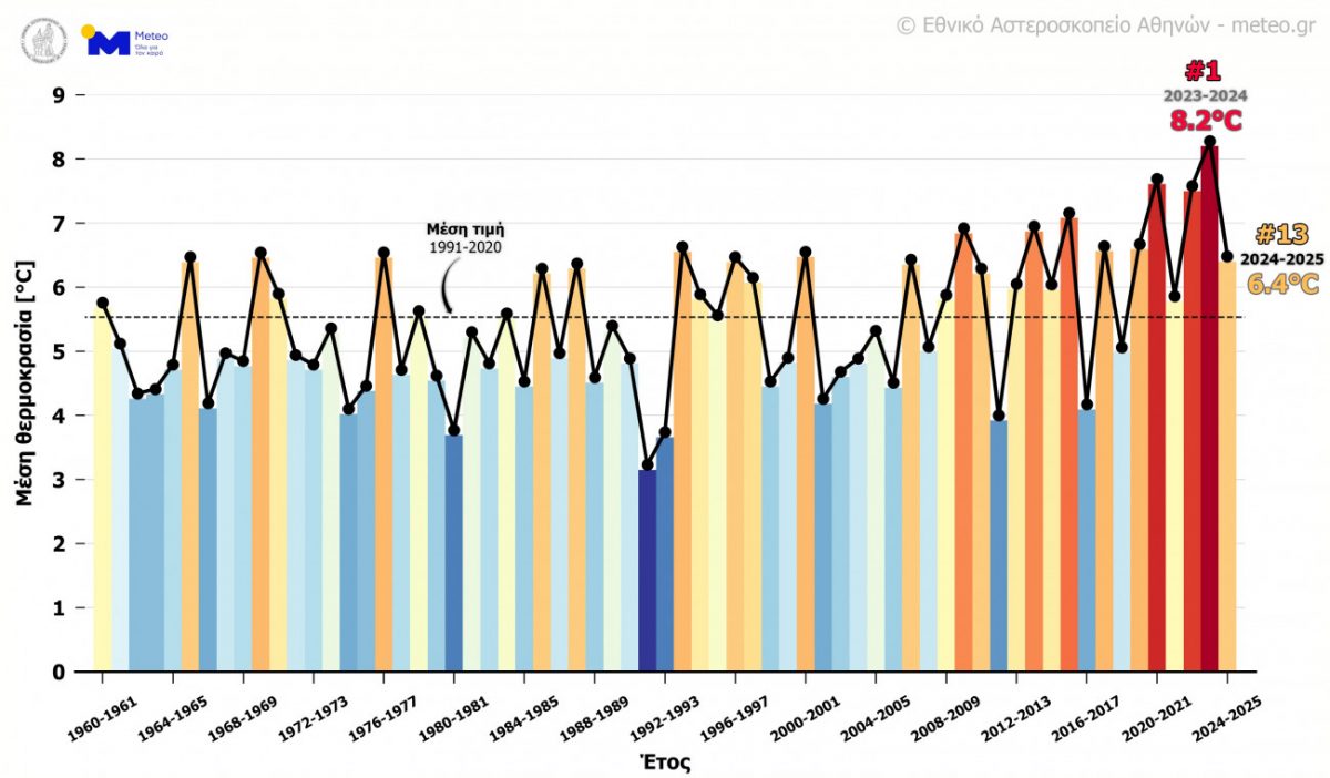 Η μέση θερμοκρασία στην Ελλάδα από το 1960 μέχρι και το 2025 για την περίοδο του χειμώνα παρουσιάζει άνοδο κατά 1,8 βαθμούς, αρκετά πάνω από τη μέση παγκόσμια άνοδο.