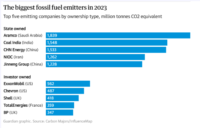 Σύμφωνα με τα στοιχεία της, αυτές οι 36 μεγάλες εταιρείες, όπως η Saudi Aramco, η ExxonMobil, η Shell και αρκετές κινεζικές, παράγουν άνθρακα, πετρέλαιο και φυσικό αέριο που ευθύνονταν για την παραγωγή περισσότερων από 20 δισ. τόνους CO2 το 2023. Ενδεικτικά, αν η Saudi Aramco ήταν χώρα, θα ήταν η τέταρτη μεγαλύτερη πηγή ρύπανσης στον κόσμο, πίσω μόνο από την Κίνα, τις ΗΠΑ και την Ινδία. Επίσης, η ExxonMobil ευθύνεται για ποσότητες CO2 που αντιστοιχούν περίπου στις εκπομπές της Γερμανίας, της ένατης μεγαλύτερης πηγής ρύπανσης στον κόσμο.