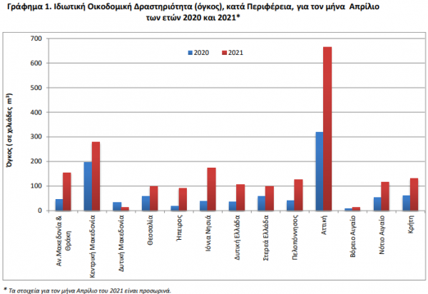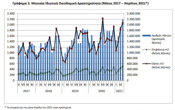 Το μέγεθος της Συνολικής Οικοδομικής Δραστηριότητας (Ιδιωτικής – Δημόσιας), κατά τον μήνα Απρίλιο 2021, στο σύνολο της Χώρας με βάση τις εκδοθείσες οικοδομικές άδειες, ανήλθε σε 2.209 οικοδομικές άδειες, που αντιστοιχούν σε 510,9 χιλιάδες m2 επιφάνειας και 2.095,0 χιλιάδες m3 όγκου, παρουσίασε δηλαδή, αύξηση κατά 124,5% στον αριθμό των οικοδομικών αδειών, κατά 162,3% στην επιφάνεια και κατά 117,8% στον όγκο, σε σχέση με τον αντίστοιχο μήνα του 2020 .