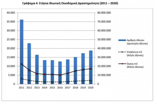Κατά την περίοδο των τελευταίων δώδεκα μηνών, δηλαδή από τον Μάιο 2020 έως τον Απρίλιο 2021, το μέγεθος της Συνολικής Οικοδομικής Δραστηριότητας (Ιδιωτικής-Δημόσιας) με βάση τις εκδοθείσες οικοδομικές άδειες, στο σύνολο της Χώρας, ανήλθε σε 20.824 οικοδομικές άδειες, που αντιστοιχούν σε 4.674,2 χιλιάδες m2 επιφάνειας και 19.755,9 χιλιάδες m3 όγκου. Σε σχέση με την αντίστοιχη περίοδο Μαΐου 2019 – Απριλίου 2020 παρατηρήθηκε αύξηση κατά 13,4% στον αριθμό των οικοδομικών αδειών, κατά 15,7% στην επιφάνεια και κατά 11,9% στον όγκο.